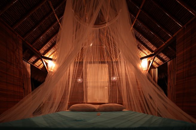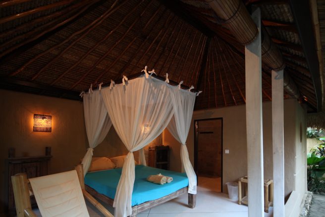 オープンエアーのお部屋はしっかり虫よけ対策されています。素敵な蚊帳の中で就寝、南国情緒あふれる雰囲気と贅沢な時間を味わえます。